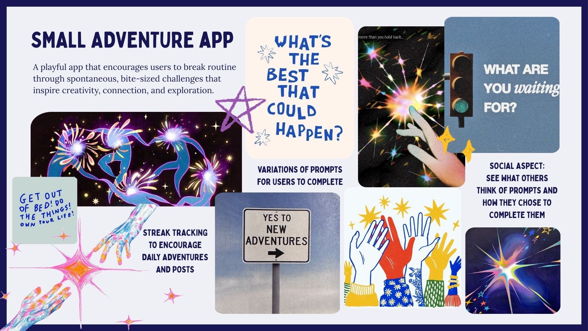 A playful micro-adventure app that encourages creatives to break routine through spontaneous, bite-sized challenges that inspire creativity, connection, and exploration.
