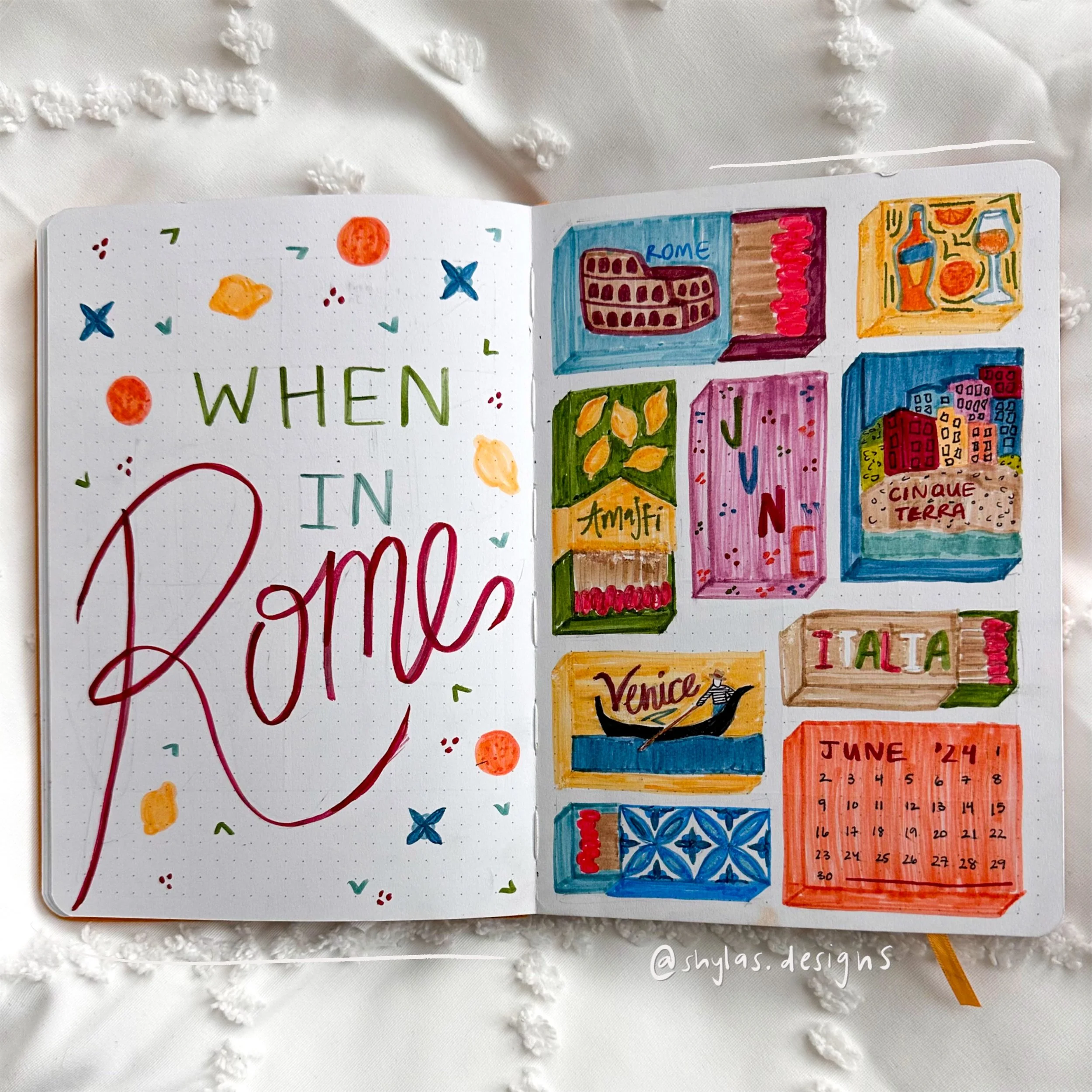 Since 2018, I have kept a bullet journal where I create colorful spreads with markers for every month. Every month, I sit down with a blank spread and a handful of colorful markers, designing layouts that help me organize my life while expressing myself creatively. It’s where my love for design and intentionality first came together: tiny boxes, hand-lettered headers, and little illustrations all working together to form something both beautiful and functional.