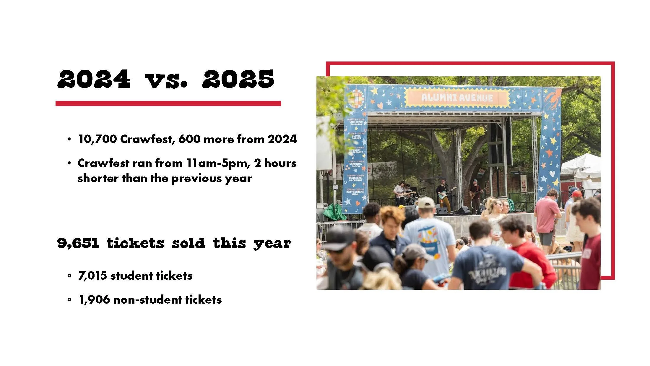 For the 2025-2026 school year, I served as the Executive Director of Crawfest. In this role, I spearheaded the planning and execution of the April 2026 festival. Every year, Crawfest features 8,000 attendees, 10,000 pounds of crawfish, live music, and more. As the Executive director, I help manage a $250k+ budget and oversee productivity of 30 organization members.