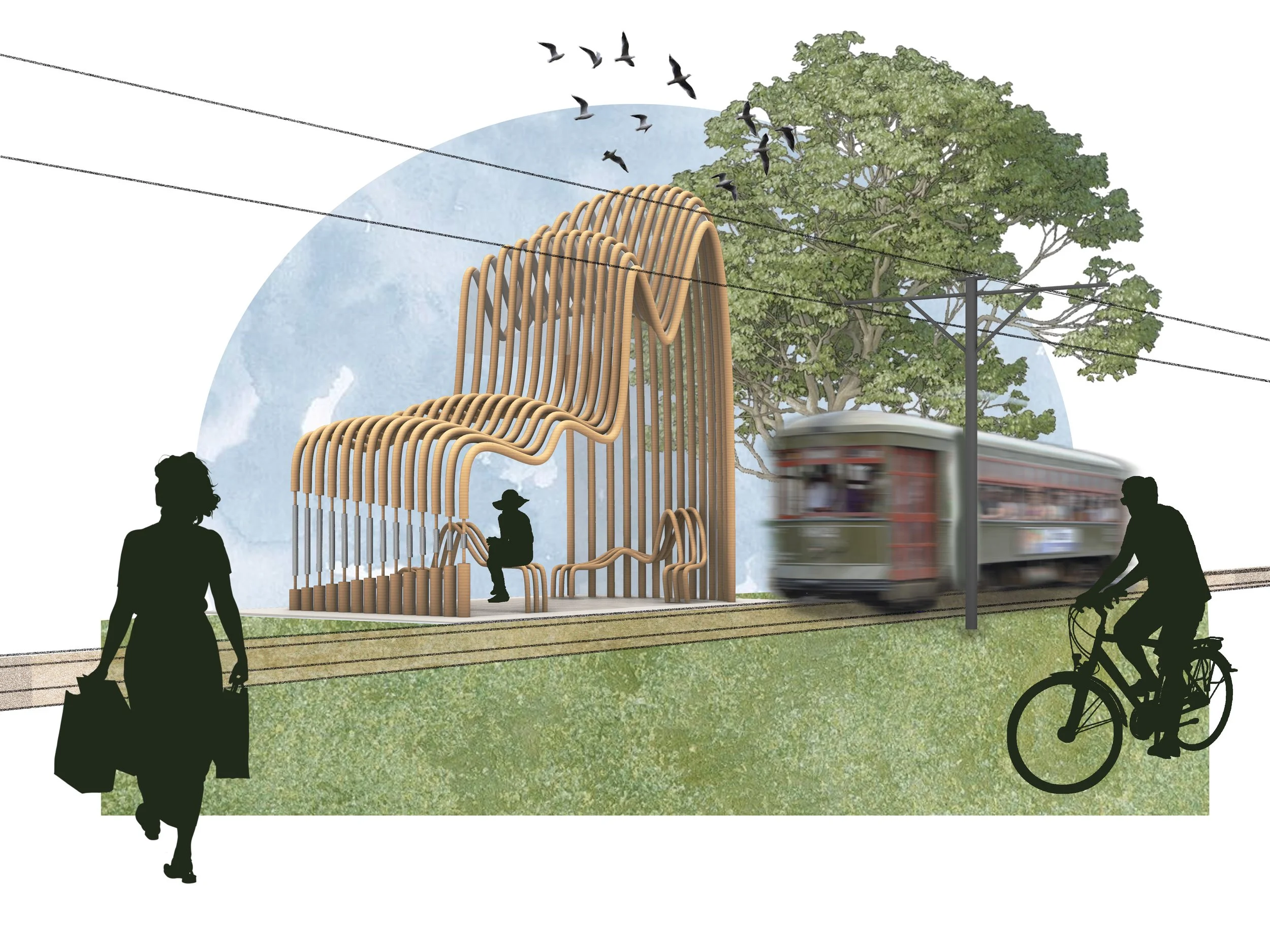 This musical pavilion transforms waiting into an interactive experience with a built-in, playable instrument of steel pipes, reminiscent of a xylophone. Users can create melodies by striking the musical pipes with a mallet. The curvilinear seating adapts to various postures for comfort. A frosted glass pane provides shelter and allows for created sound to fill the space without completely obstructing views of the streetcar’s arrival.